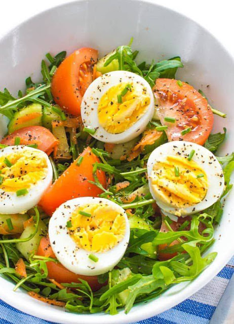 - In a large bowl, add the arugula, sliced tomatoes, and cucumber.
